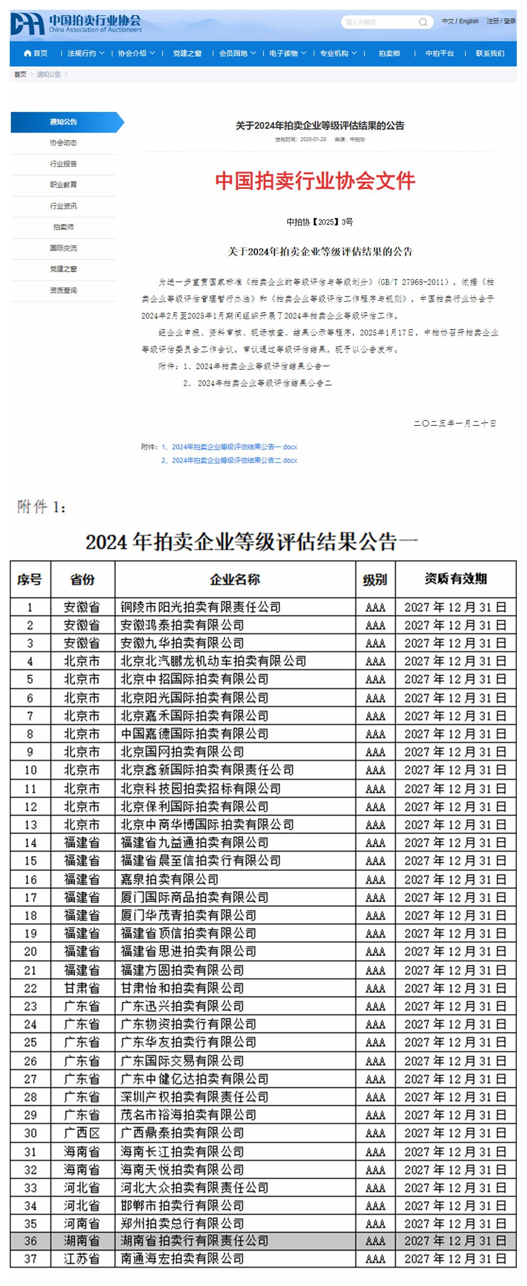 湖南省拍卖行荣获中国拍卖行业协会aaa级资质